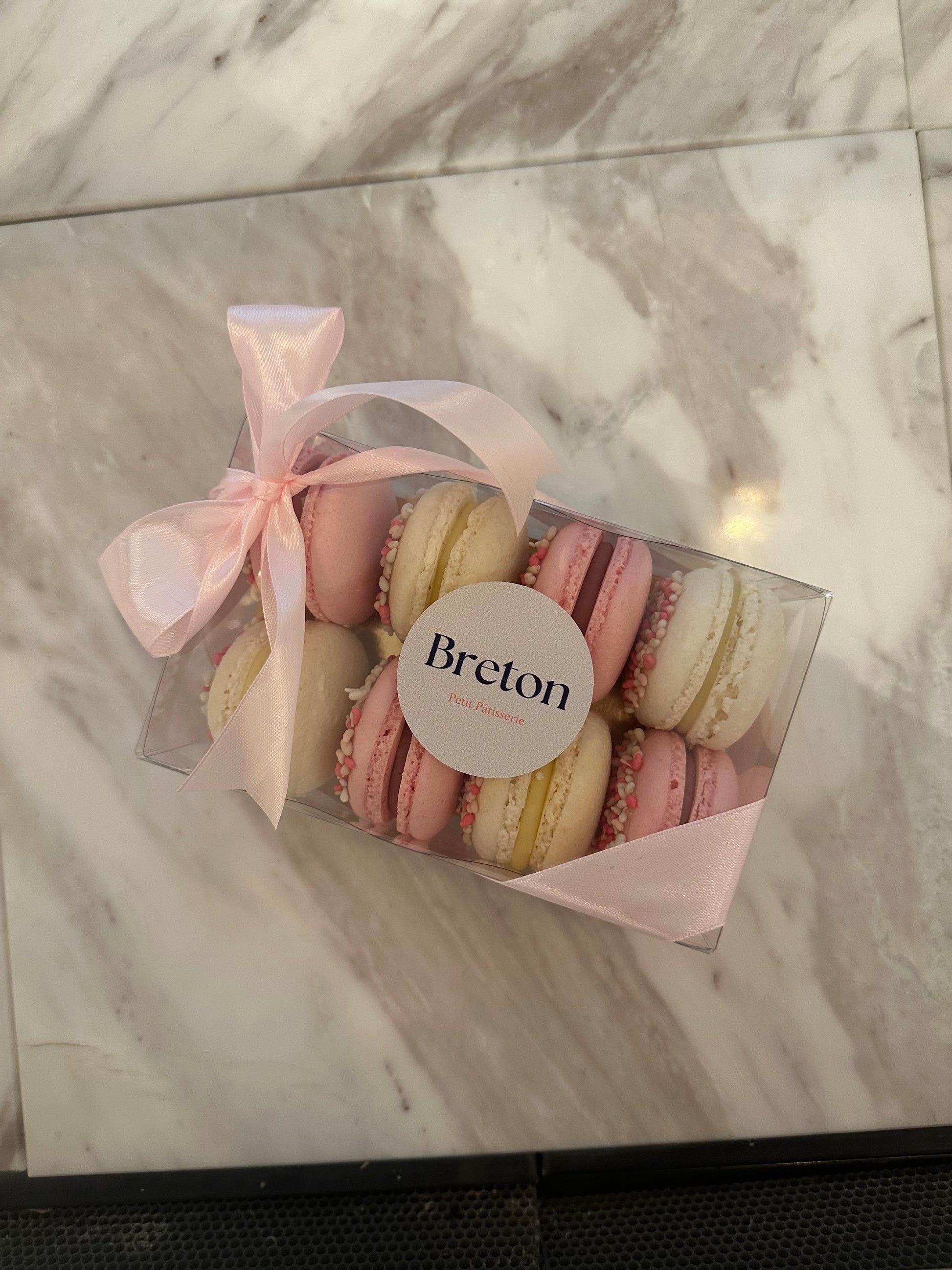 de samengestelde doosjes bevatten standaard een mix van blauwe en witte macarons óf roze en witte macarons met de daarbij behorende kleur muisjes.