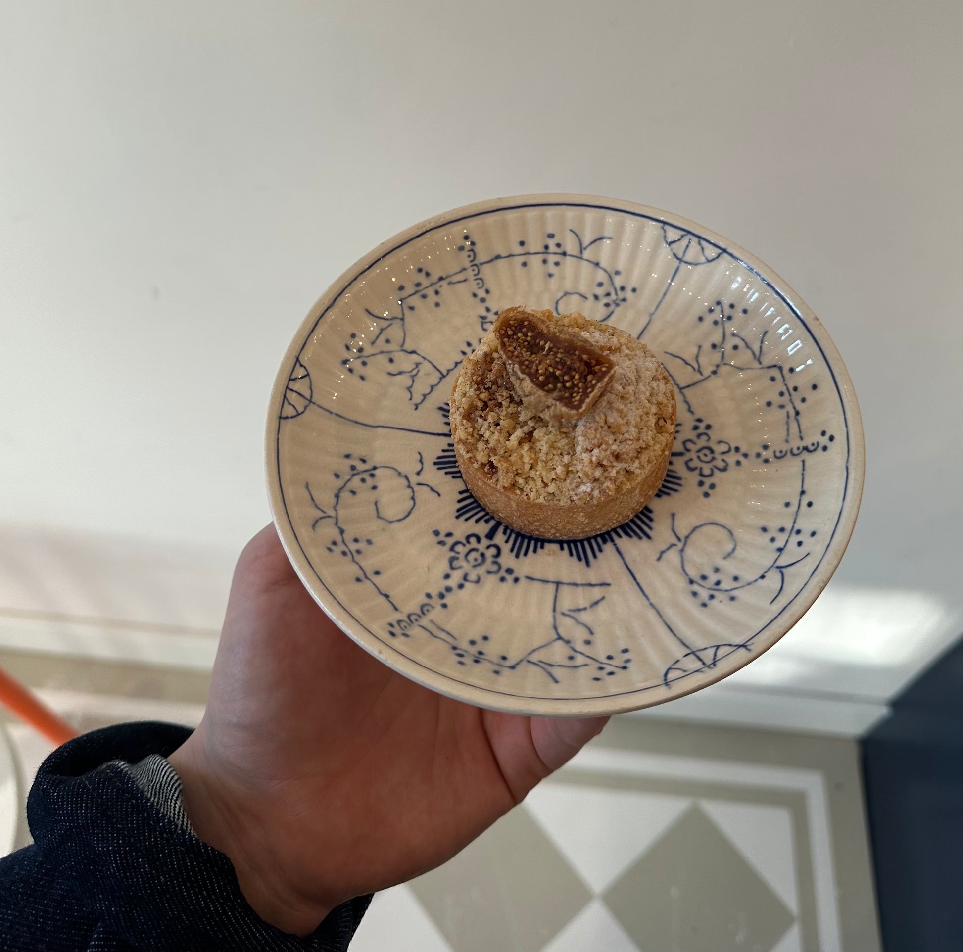 Knapperige bodem van zanddeeg met een meegebakken hazelnoot crème, vijgen compote en hazelnoten crumble